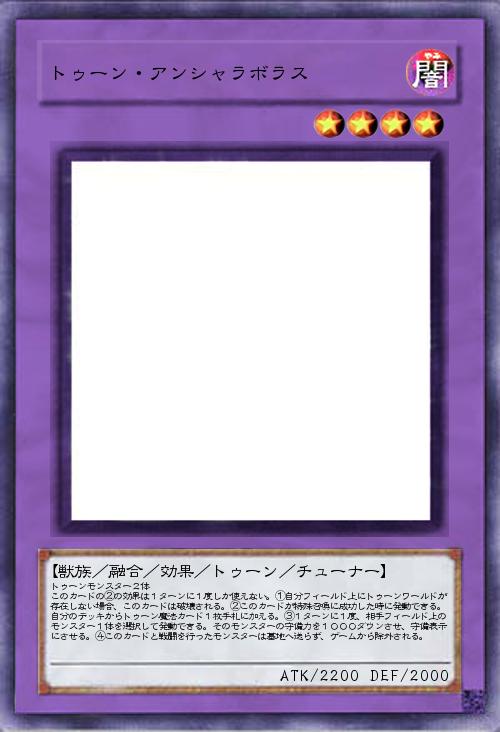 | トゥーンモンスター2体 このカードの②の効果は1ターンに1度しか使えない。①自分フィールド上にトゥーンワールドが存在しない場合、このカードは破壊される。②このカードが特殊召喚に成功した時に発動できる。自分のデッキからトゥーン魔法カード1枚手札に加える。③1ターンに1度、相手フィールド上のモンスター1体を選択して発動できる。そのモンスターの守備力を1000ダウンさせ、守備表示にさせる。④このカードと戦闘を行ったモンスターは墓地へ送らず、ゲームから除外される。 | |||