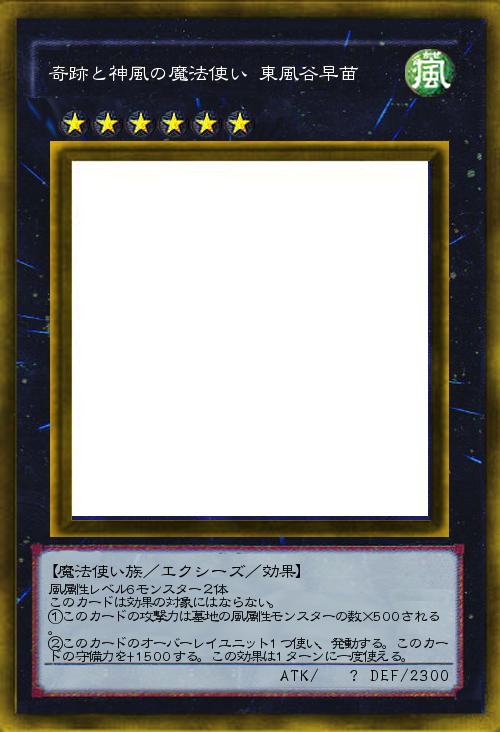 | 風属性レベル6モンスター2体 このカードは効果の対象にはならない。 ①このカードの攻撃力は墓地の風属性モンスターの数×500される。 ②このカードのオーバーレイユニット1つ使い、発動する。このカードの守備力を+1500する。この効果は1ターンに一度使える。 | |||