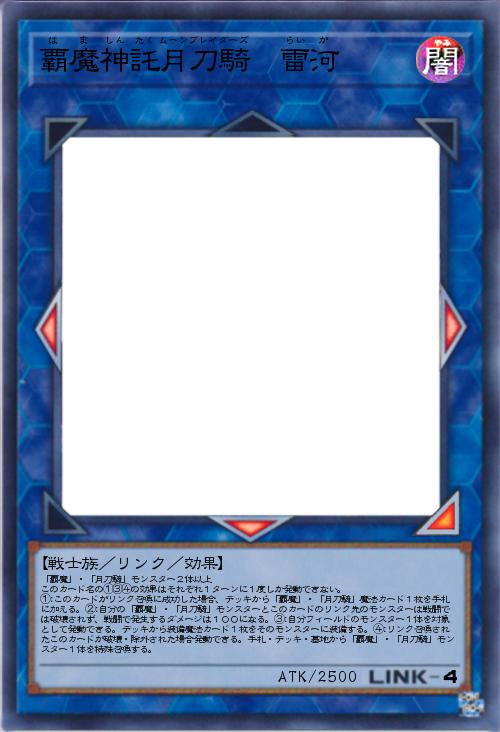 | 「覇魔」・「月刀騎」モンスター2体以上 このカード名の①③④の効果はそれぞれ1ターンに1度しか発動できない。 ①:このカードがリンク召喚に成功した場合、デッキから「覇魔」・「月刀騎」魔法カード1枚を手札に加える。②:自分の「覇魔」・「月刀騎」モンスターとこのカードのリンク先のモンスターは戦闘では破壊されず、戦闘で発生するダメージは100になる。③:自分フィールドのモンスター1体を対象として発動できる。デッキから装備魔法カード1枚をそのモンスターに装備する。④:リンク召喚されたこのカードが破壊・除外された場合発動できる。手札・デッキ・墓地から「覇魔」・「月刀騎」モンスター1体を特殊召喚する。 | |||