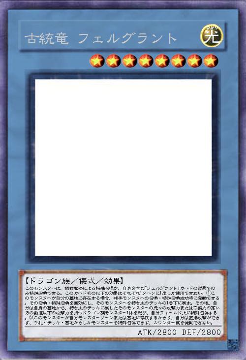 | このモンスターは、儀式魔法による特殊召喚か、自身を含む「フェルグラント」カードの効果でのみ特殊召喚できる。このカード名の以下の効果はそれぞれ1ターンに1度しか使用できない。①このモンスターが自分の墓地に存在する場合、相手モンスターの召喚・特殊召喚成功時に発動できる。その召喚・特殊召喚を無効にし、そのモンスターを持ち主のデッキの1番下に戻す。その後、自分は自身の墓地から、持ち主のデッキに戻したそのモンスターの元々の攻撃力または守備力の高い方の数値以下の攻撃力を持つドラゴン族モンスター1体を選び、自分フィールド上に特殊召喚する。②このモンスターが自分モンスターゾーンまたは墓地に存在するかぎり、自分は直接攻撃ができず、手札・デッキ・墓地からしかモンスターを特殊召喚できず、カウンター罠を発動できない。 | |||
