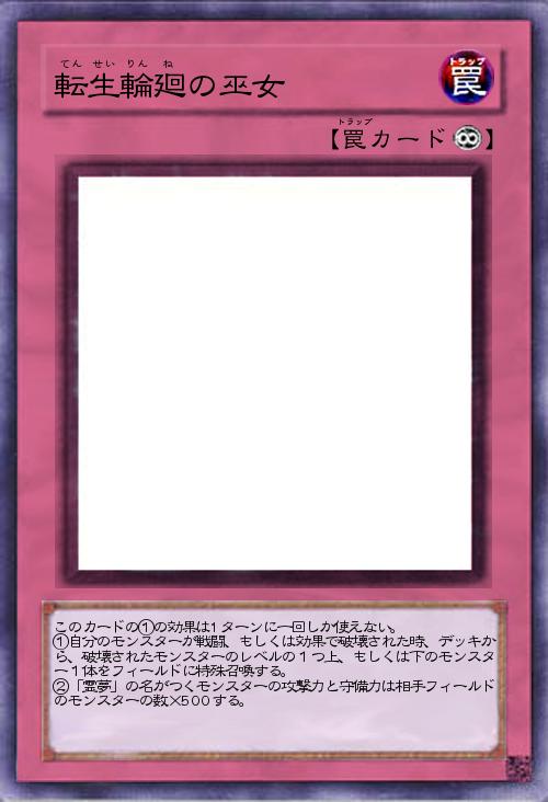 | このカードの①の効果は1ターンに一回しか使えない。 ①自分のモンスターが戦闘、もしくは効果で破壊された時、デッキから、破壊されたモンスターのレベルの1つ上、もしくは下のモンスター1体をフィールドに特殊召喚する。 ②「霊夢」の名がつくモンスターの攻撃力と守備力は相手フィールドのモンスターの数×500する。 | |||