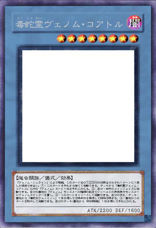 「ヴェノムの儀式モンスターを考えました。①はこのカードと同名以外の「ヴェノム」カードをサーチする効果で、基本的にはこのカードを儀式召喚するカードをサーチして、状況に応じて他のカードもサーチできるようにこのような効果にしました。②の効果はフリーチェーンで使える効果で、ヴェノムカウンターは複数のモンスターに振り分けて置くことができます。③④の効果でヴェノミナーガの召喚をサポートしています。このカードを儀式召喚するカードは手札・デッキの「ヴェノム」モンスターをこのカードのレベル分墓地へ送り、墓地からこのカードを儀式召喚する効果を持つ永続魔法で、発動時にヴェノムカウンターを置く効果を持つカード1枚をサーチする効果と、ヴェノム・スワンプの効果で攻撃力がダウンしている相手モンスターの効果を無効化し、そのモンスターが「ヴェノム」、「ヴェノミ」モンスターと戦闘を行うことで相手が受ける戦闘ダメージを倍にする効果を持っています。」(2021-05-16 23:23)