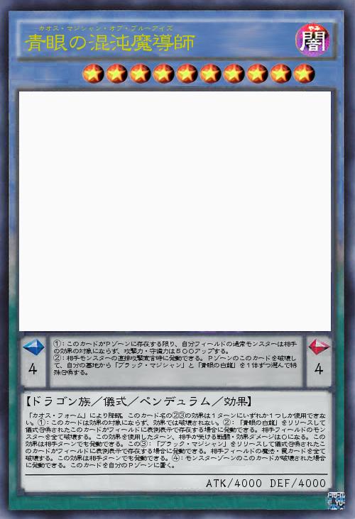 | 「カオス・フォーム」により降臨。このカード名の②③の効果は1ターンにいずれか1つしか使用できない。①:このカードは効果の対象にならず、効果では破壊されない。②:「青眼の白龍」をリリースして儀式召喚されたこのカードがフィールドに表側表示で存在する場合に発動できる。相手フィールドのモンスターを全て破壊する。この効果を使用したターン、相手が受ける戦闘・効果ダメージは0になる。この効果は相手ターンでも発動できる。この③:「ブラック・マジシャン」をリリースして儀式召喚されたこのカードがフィールドに表側表示で存在する場合に発動できる。相手フィールドの魔法・罠カードを全て破壊する。この効果は相手ターンでも発動できる。④:モンスターゾーンのこのカードが破壊された場合に発動できる。このカードを自分のPゾーンに置く。 | |||