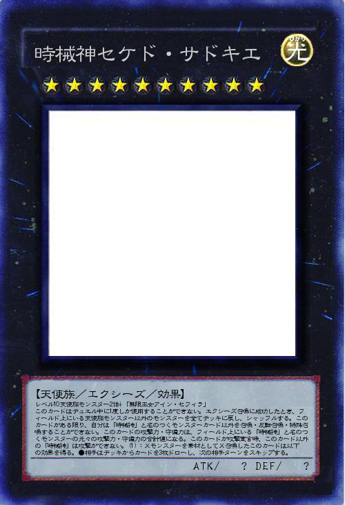| レベル10天使族モンスター2体+「無限巫女アイン・セフィラ」 このカードはデュエル中に1度しか使用することができない。エクシーズ召喚に成功したとき、フィールド上にいる天使族モンスター以外のモンスターを全てデッキに戻し、シャッフルする。このカードがある限り、自分は「時械神」と名のつくモンスターカード以外を召喚・反転召喚・特殊召喚することができない。このカードの攻撃力・守備力は、フィールド上にいる「時械神」と名のつくモンスターの元々の攻撃力・守備力の合計値になる。このカードが攻撃宣言時、このカード以外の「時械神」は攻撃ができない。(1):Xモンスターを素材としてX召喚したこのカードは以下の効果を得る。●相手はデッキからカードを3枚ドローし、次の相手ターンをスキップする。 | |||