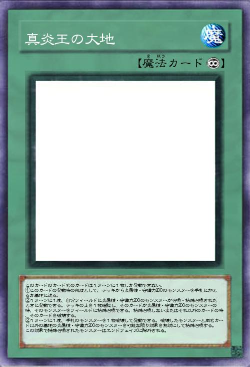 | このカードのカード名のカードは1ターンに1枚しか発動できない。 ①このカードの発動時の処理として、デッキから炎属性・守備力200のモンスターを手札に加えるか墓地に送る。 ②1ターンに1度、自分フィールドに炎属性・守備力200のモンスターが召喚・特殊召喚されたときに発動できる。デッキの上を1枚確認し、そのカードが炎属性・守備力200のモンスターの時、そのモンスターをフィールドに特殊召喚できる。特殊召喚しないまたはそれ以外のカードの時、そのカードを破壊する。 ②1ターンに1度、手札のモンスターを1枚破壊して発動できる。破壊したモンスターと同名カード以外の墓地の炎属性・守備力200のモンスターを可能な限り効果を無効にして特殊召喚する。この効果で特殊召喚されたモンスターはエンドフェイズに除外される。 | |||