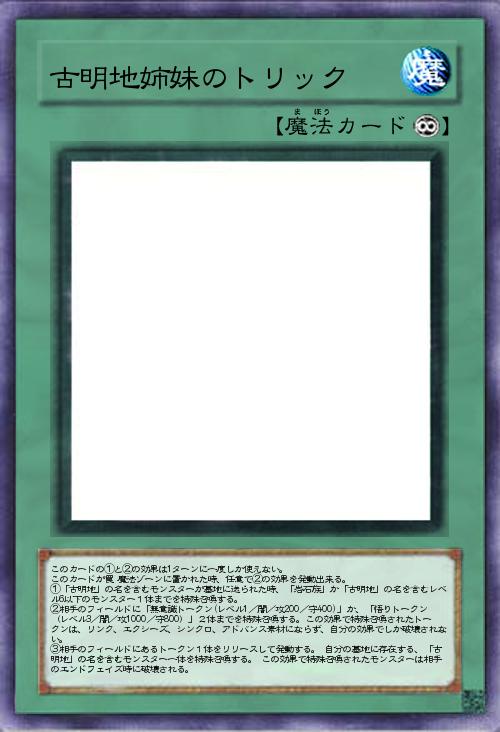 | このカードの①と②の効果は1ターンに一度しか使えない。 このカードが罠·魔法ゾーンに置かれた時、任意で②の効果を発動出来る。 ①「古明地」の名を含むモンスターが墓地に送られた時、「岩石族」か「古明地」の名を含むレベル6以下のモンスター1体までを特殊召喚する。 ②相手のフィールドに「無意識トークン(レベル1/闇/攻200/守400)」か、「悟りトークン(レベル3/闇/攻1000/守800)」2体までを特殊召喚する。この効果で特殊召喚されたトークンは、リンク、エクシーズ、シンクロ、アドバンス素材にならず、自分の効果でしか破壊されない。 ③相手のフィールドにあるトークン1体をリリースして発動する。 自分の墓地に存在する、「古明地」の名を含むモンスター一体を特殊召喚する。 この効果で特殊召喚されたモンスターは相手のエンドフェイズ時に破壊される。 | |||