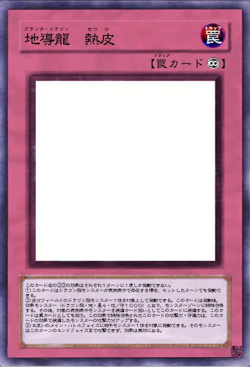| このカード名の②③の効果はそれぞれ1ターンに1度しか発動できない。 ①:このカードはドラゴン族モンスターが表側表示で存在する場合、セットしたターンでも発動できる。 ②:自分フィールドのドラゴン族モンスター1体を対象として発動できる。このカードは発動後、効果モンスター(ドラゴン族・地・星4・攻/守1000)となり、モンスターゾーンに特殊召喚する。その後、対象の表側表示モンスターを装備カード扱いとしてこのカードに装備する。このカードは罠カードとしても扱う。この効果で特殊召喚されたこのカードの攻撃力・守備力は、このカードの効果で装備したモンスターの攻撃力分アップする。 ③:お互いのメイン・バトルフェイズに相手モンスター1体を対象に発動できる。そのモンスターはこのターンのエンドフェイズまで攻撃できず、効果は無効になる。 | |||