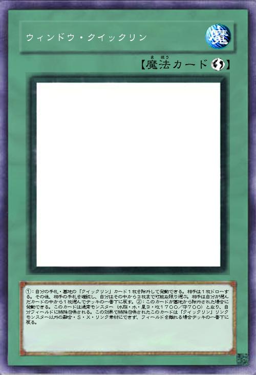 | ①:自分の手札・墓地の「クイックリン」カード1枚を除外して発動できる。相手は1枚ドローする。その後、相手の手札を確認し、自分はその中から3枚まで可能な限り選ぶ。相手は自分が選んだカードの中から1枚選んでデッキの一番下に戻す。②:このカードが墓地から除外された場合に発動できる。このカードは通常モンスター(水族・水・星3・攻1700/守700)となり、自分フィールドに特殊召喚される。この効果で特殊召喚されたこのカードは「クイックリン」リンクモンスター以外の融合・S・X・リンク素材にできず、フィールドを離れる場合デッキの一番下に戻る。 | |||
