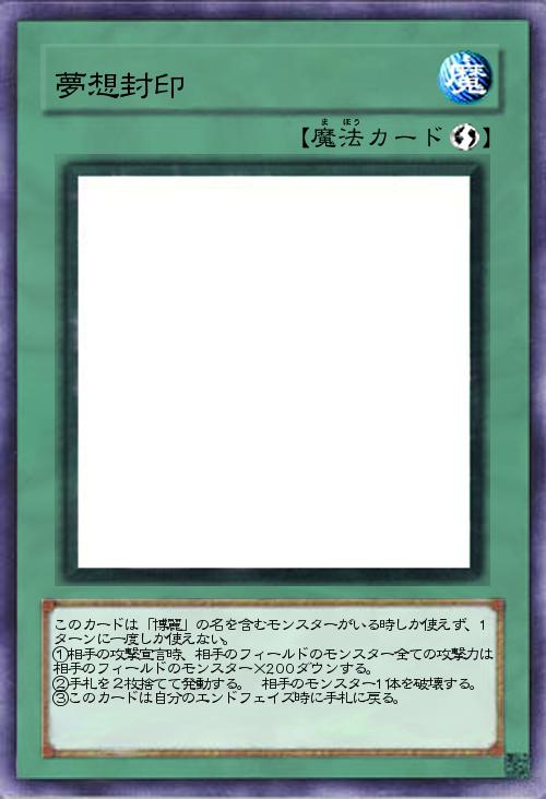 | このカードは「博麗」の名を含むモンスターがいる時しか使えず、1ターンに一度しか使えない。 ①相手の攻撃宣言時、相手のフィールドのモンスター全ての攻撃力は相手のフィールドのモンスター×200ダウンする。 ②手札を2枚捨てて発動する。 相手のモンスター1体を破壊する。 ③このカードは自分のエンドフェイズ時に手札に戻る。 | |||