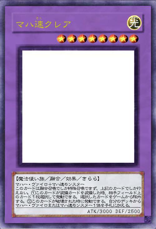 | マハー・ヴァイロ+マハ速モンスター このカードは融合召喚でしか特殊召喚できず、上記のカードでしか行えない。①このカードが装備カードを装備した時、相手フィールド上のカード1枚選択して発動できる。選択したカードをゲームから除外する。②このカードが破壊された時に発動できる。自分のデッキからマハー・ヴァイロまたはマハ速モンスター1体を手札に加える。 | |||