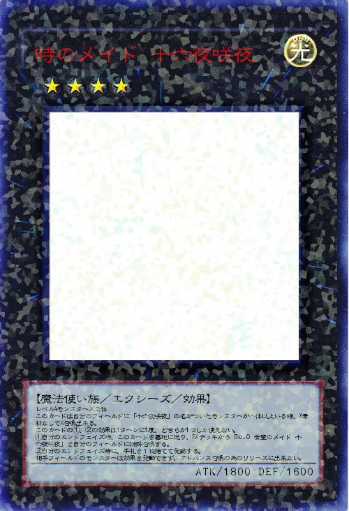 | レベル4モンスター×2体 このカードは自分のフィールドに「十六夜咲夜」の名がついたモンスターが一体以上いる時、X素材なしでX召喚出来る。 このカードの①、②の効果は1ターンに1度、どちらか1つしか使えない。 ①自分のエンドフェイズ時、このカードを墓地に送り、EXデッキから「No.0 希望のメイド 十六夜咲夜」を自分のフィールドに特殊召喚する。 ②自分のエンドフェイズ時に、手札を1枚捨てて発動する。 相手フィールドのモンスターは効果を発動できず、アドバンス召喚の為のリリースに出来ない。 | |||