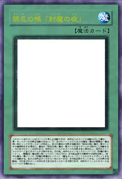 | このカード名のカードは1ターンに1度しか発動できず、相手はこのカードの発動に対して魔法・罠・モンスターの効果は発動できない。①:自分のフィールドに元々の種族・属性が闇属性・魔法使い族のリンク5モンスターが存在し、自分の墓地に効果を発動済の「禁忌の帳」魔法・罠カードが4種類存在する場合に、墓地の「禁忌の帳」魔法・罠カードを全てゲームから除外して発動する。次の自分のターンの初めまで、相手のフィールドのカードの効果を全て無効化し、相手のフィールドのカード全てをゲームから除外する。その後、相手のメインモンスターゾーンに「封魔の宴トークン」(闇属性・魔法使い族・レベル1・攻0/守0)を可能な限り攻撃表示で特殊召喚し、相手の魔法・罠ゾーンに「封魔の宴魔法トークン」(魔法カード:①:1000ライフポイントを払って発動する。自分と相手はデッキから1枚ドローする)を可能な限りセットする。この効果の発動後、次 | |||