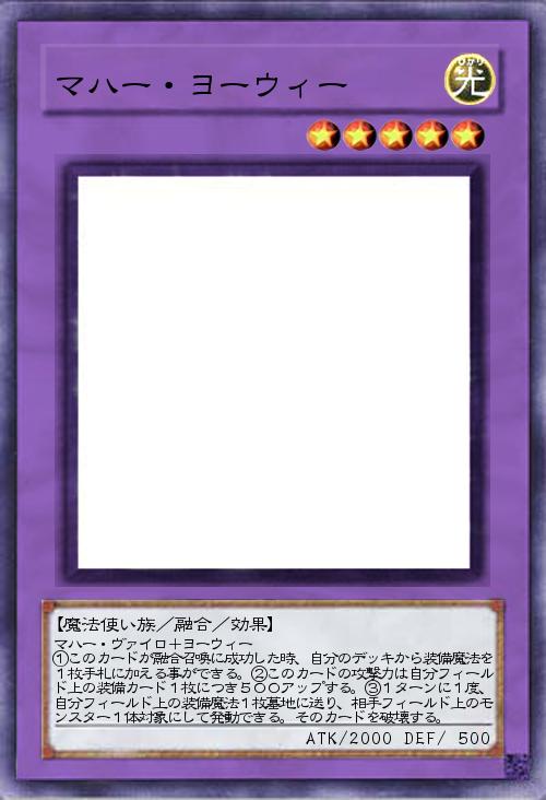 | マハー・ヴァイロ+ヨーウィー ①このカードが融合召喚に成功した時、自分のデッキから装備魔法を1枚手札に加える事ができる。②このカードの攻撃力は自分フィールド上の装備カード1枚につき500アップする。③1ターンに1度、自分フィールド上の装備魔法1枚墓地に送り、相手フィールド上のモンスター1体対象にして発動できる。そのカードを破壊する。 | |||
