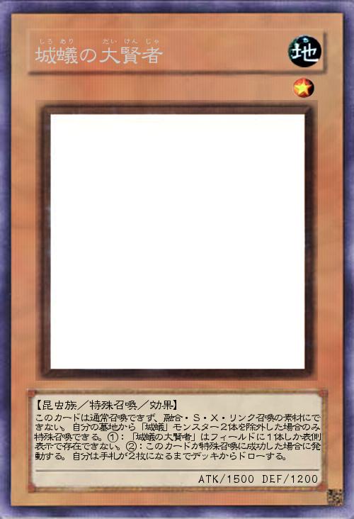 | このカードは通常召喚できず、融合・S・X・リンク召喚の素材にできない。自分の墓地から「城蟻」モンスター2体を除外した場合のみ特殊召喚できる。①:「城蟻の大賢者」はフィールドに1体しか表側表示で存在できない。②:このカードが特殊召喚に成功した場合に発動する。自分は手札が2枚になるまでデッキからドローする。 | |||