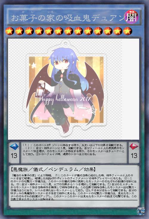| 「魔法のお菓子の家」により降臨。 (1):このカードが儀式召喚に成功した時、相手フィールド上のカードを全て破壊し、破壊した枚数x300ポイントのライフダメージを相手プレイヤーに与える。(2):このカードの攻撃力・守備力は、このカードの儀式召喚に使用したモンスターのそれぞれの数値の合計になる。(3):自分・相手ターンに1度、以下の効果から1つを選択して発動できる。①:自分のEXデッキからモンスター1体を召喚条件を無視して特殊召喚する。この効果で特殊召喚したモンスターは攻撃力・守備力は0になり、レベルを持たないモンスターとして扱う。②LPを半分を払って発動できる。自分のEXデッキの悪魔族モンスターを5体まで相手に見せる。このカードの攻撃力・守備力は、見せたモンスターのそれぞれの数値分アップし、このターンこのカードは見せたモンスターの数まで攻撃できる。この効果で見せたモンスターは除外する。 | |||