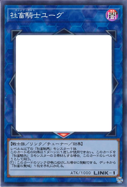 | レベル4以下の「社畜戦馬」モンスター1体 このカード名の効果は1ターンに1度しか使用できない。このカードを「社畜騎兵」SモンスターのS素材とする場合、このカードのレベルを1として扱う。 ①:このカードのリンク召喚に成功した場合に発動できる。デッキから「社畜の聖域」1枚を手札に加える。 | |||