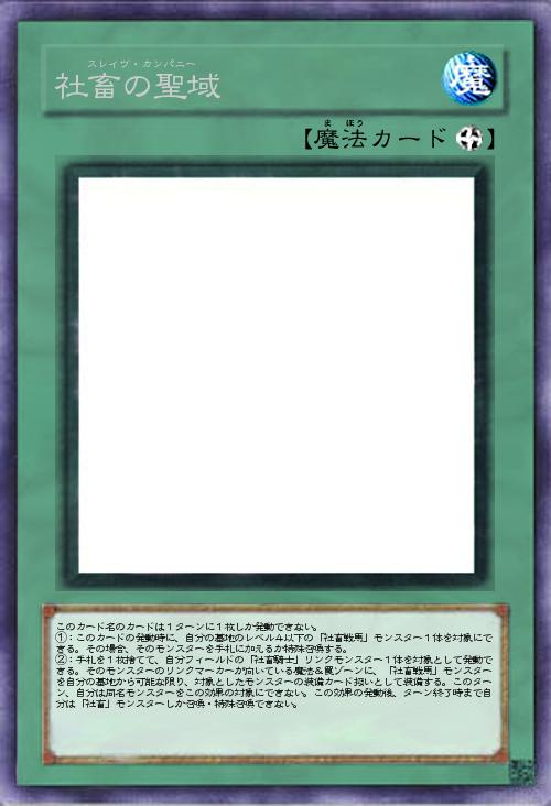 | このカード名のカードは1ターンに1枚しか発動できない。 ①:このカードの発動時に、自分の墓地のレベル4以下の「社畜戦馬」モンスター1体を対象にできる。その場合、そのモンスターを手札に加えるか特殊召喚する。 ②:手札を1枚捨てて、自分フィールドの「社畜騎士」リンクモンスター1体を対象として発動できる。そのモンスターのリンクマーカーが向いている魔法&罠ゾーンに、「社畜戦馬」モンスターを自分の墓地から可能な限り、対象としたモンスターの装備カード扱いとして装備する。このターン、自分は同名モンスターをこの効果の対象にできない。この効果の発動後、ターン終了時まで自分は「社畜」モンスターしか召喚・特殊召喚できない。 | |||