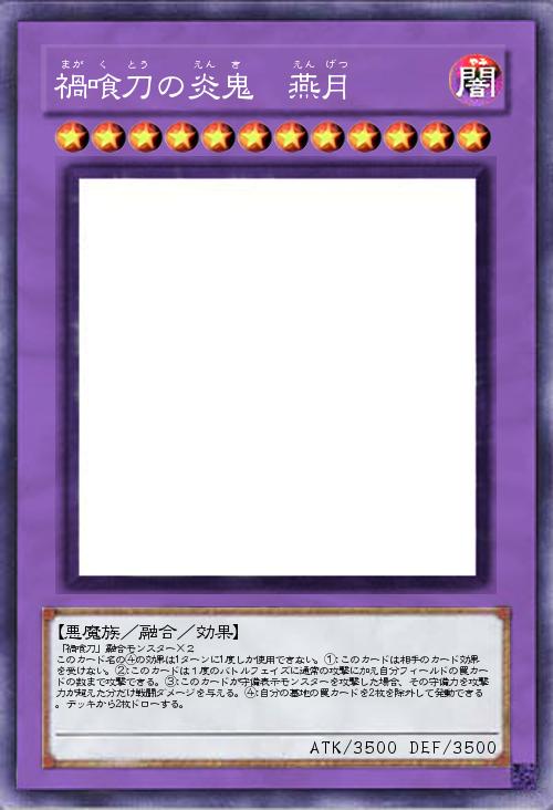 | 「禍喰刀」融合モンスター×2 このカード名の④の効果は1ターンに1度しか使用できない。①:このカードは相手のカード効果を受けない。②:このカードは1度のバトルフェイズに通常の攻撃に加え自分フィールドの罠カードの数まで攻撃できる。③:このカードが守備表示モンスターを攻撃した場合、その守備力を攻撃力が超えた分だけ戦闘ダメージを与える。④:自分の墓地の罠カードを2枚を除外して発動できる。デッキから2枚ドローする。 | |||
