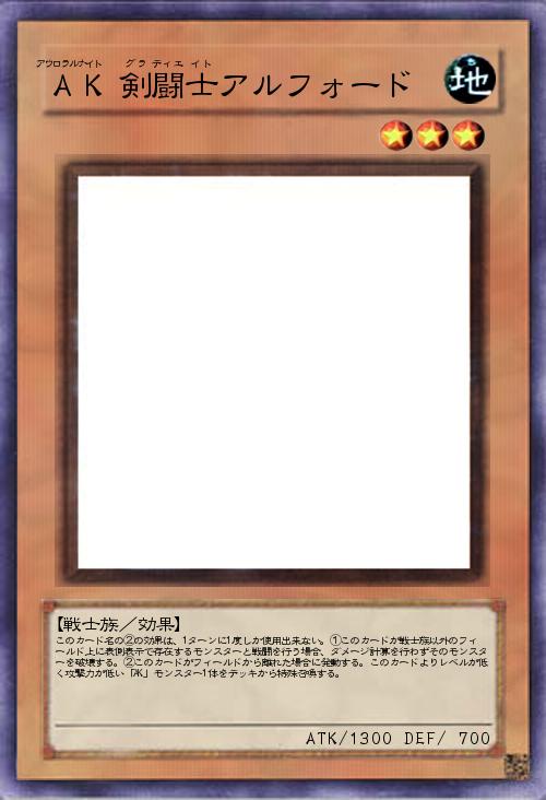 | このカード名の②の効果は、1ターンに1度しか使用出来ない。①このカードが戦士族以外のフィールド上に表側表示で存在するモンスターと戦闘を行う場合、ダメージ計算を行わずそのモンスターを破壊する。②このカードがフィールドから離れた場合に発動する。このカードよりレベルが低く攻撃力が低い「AK」モンスター1体をデッキから特殊召喚する。 | |||