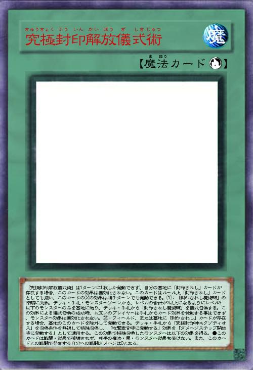 | 「究極封印解放儀式術」は1ターンに1枚しか発動できず、自分の墓地に「封印されし」カードが存在する場合、このカードの効果は無効化されない。このカードはルール上「封印されし」カードとしても扱い、このカードの②の効果は相手ターンでも発動できる。①:「封印されし魔術師」の降臨に必要。デッキ・手札・モンスターゾーンから、レベルの合計が7以上になるようにレベル3以下のモンスターのみを墓地に送り、デッキ・手札から「封印されし魔術師」を儀式召喚する。この効果による儀式召喚の成功時、お互いのプレイヤーは手札からカード効果を発動する事はできず、モンスター効果は無効化されない。②:フィールド、または墓地に「封印されし」カードが存在する場合、墓地のこのカードを除外して発動できる。デッキ・手札から「究極封印神エクゾディオス」を召喚条件を無視して特殊召喚し、「攻撃宣言時に発動する」効果を「ダメージステップ開始時に発動 | |||