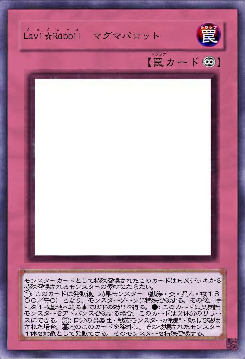 | モンスターカードとして特殊召喚されたこのカードはEXデッキから特殊召喚されるモンスターの素材にならない。 ①:このカードは発動後、効果モンスター(獣族・炎・星4・攻1800/守0)となり、モンスターゾーンに特殊召喚する。その後、手札を1枚墓地へ送る事で以下の効果を得る。●:このカードは炎属性モンスターをアドバンス召喚する場合、このカードは2体分のリリースにできる。②:自分の炎属性・獣族モンスターが戦闘・効果で破壊された場合、墓地のこのカードを除外し、その破壊されたモンスター1体を対象として発動できる。そのモンスターを特殊召喚する。 | |||