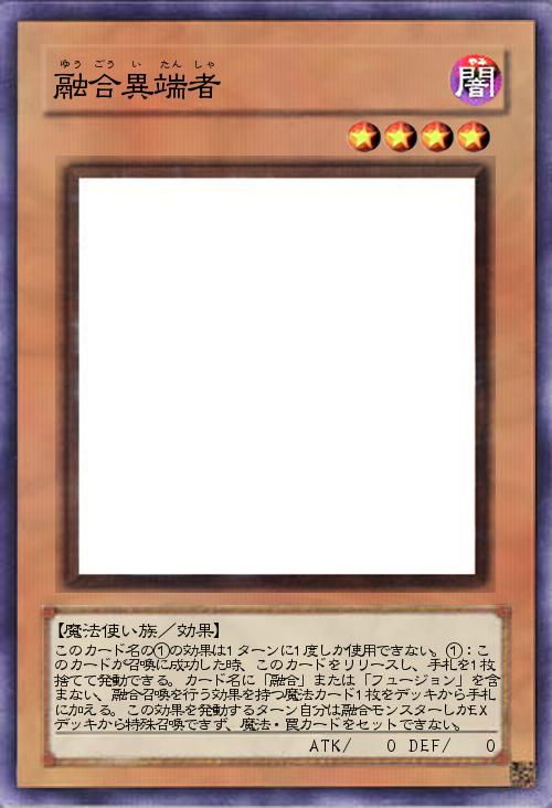 | このカード名の①の効果は1ターンに1度しか使用できない。①:このカードが召喚に成功した時、このカードをリリースし、手札を1枚捨てて発動できる。カード名に「融合」または「フュージョン」を含まない、融合召喚を行う効果を持つ魔法カード1枚をデッキから手札に加える。この効果を発動するターン自分は融合モンスターしかEXデッキから特殊召喚できず、魔法・罠カードをセットできない。 | |||