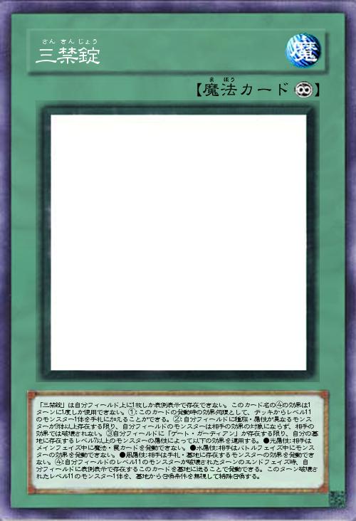 | 「三禁錠」は自分フィールド上に1枚しか表側表示で存在できない。このカード名の④の効果は1ターンに1度しか使用できない。①:このカードの発動時の効果処理として、デッキからレベル11のモンスター1体を手札に加えることができる。②:自分フィールドに種族・属性が異なるモンスターが3体以上存在する限り、自分フィールドのモンスターは相手の効果の対象にならず、相手の効果では破壊されない。③自分フィールドに「ゲート・ガーディアン」が存在する限り、自分の墓地に存在するレベル7以上のモンスターの属性によって以下の効果を適用する。●光属性:相手はメインフェイズ中に魔法・罠カードを発動できない。●水属性:相手はバトルフェイズ中にモンスターの効果を発動できない。●風属性:相手は手札・墓地に存在するモンスターの効果を発動できない。④:自分フィールドのレベル11のモンスターが破壊されたターンのエンドフェイズ時、自分フィ | |||