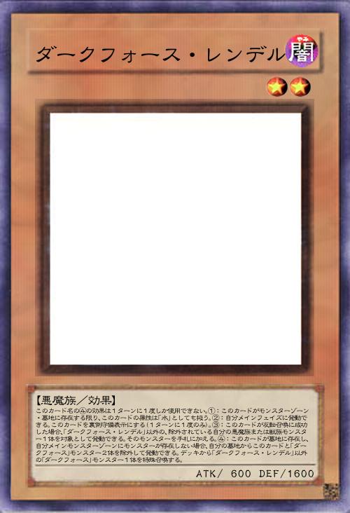 | このカード名の④の効果は1ターンに1度しか使用できない。①:このカードがモンスターゾーン・墓地に存在する限り、このカードの属性は「水」としても扱う。②:自分メインフェイズに発動できる。このカードを裏側守備表示にする(1ターンに1度のみ)。③:このカードが反転召喚に成功した場合、「ダークフォース・レンデル」以外の、除外されている自分の悪魔族または獣族モンスター1体を対象として発動できる。そのモンスターを手札に加える。④:このカードが墓地に存在し、自分メインモンスターゾーンにモンスターが存在しない場合、自分の墓地からこのカードと「ダークフォース」モンスター2体を除外して発動できる。デッキから「ダークフォース・レンデル」以外の「ダークフォース」モンスター1体を特殊召喚する。 | |||