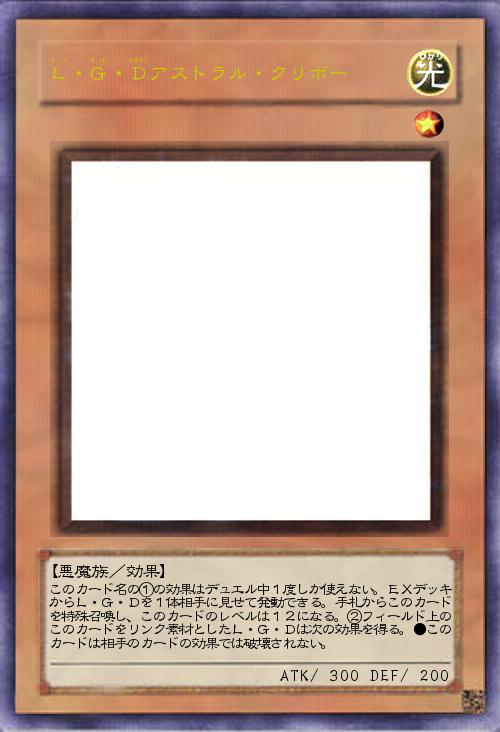 | このカード名の①の効果はデュエル中1度しか使えない。EXデッキからL・G・Dを1体相手に見せて発動できる。手札からこのカードを特殊召喚し、このカードのレベルは12になる。②フィールド上のこのカードをリンク素材としたL・G・Dは次の効果を得る。●このカードは相手のカードの効果では破壊されない。 | |||