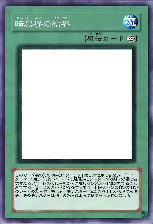 | このカード名の②の効果は1ターンに1度しか使用できない。①:1ターンに1度、自分フィールドの悪魔族モンスターが戦闘・効果で破壊される場合、代わりに手札から悪魔族モンスター1体を捨てることができる。②:このカードが存在する限り、相手ターンに自分が自分のカードの効果で「暗黒界」モンスター1体のみを手札から捨てた場合、そのモンスターは相手の効果によって捨てられた扱いになる。 | |||