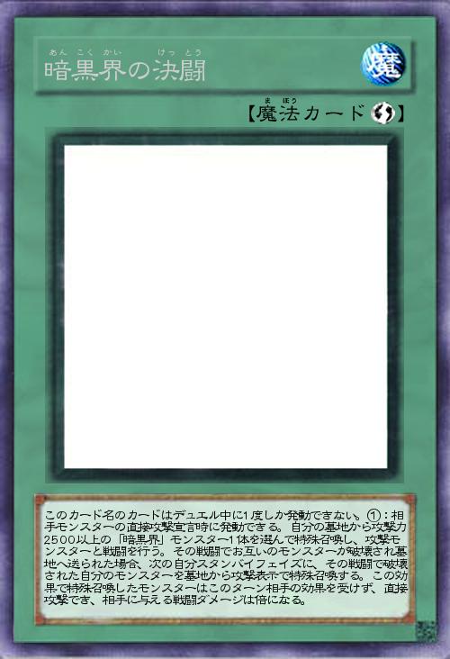 | このカード名のカードはデュエル中に1度しか発動できない。①:相手モンスターの直接攻撃宣言時に発動できる。自分の墓地から攻撃力2500以上の「暗黒界」モンスター1体を選んで特殊召喚し、攻撃モンスターと戦闘を行う。その戦闘でお互いのモンスターが破壊され墓地へ送られた場合、次の自分スタンバイフェイズに、その戦闘で破壊された自分のモンスターを墓地から攻撃表示で特殊召喚する。この効果で特殊召喚したモンスターはこのターン相手の効果を受けず、直接攻撃でき、相手に与える戦闘ダメージは倍になる。 | |||