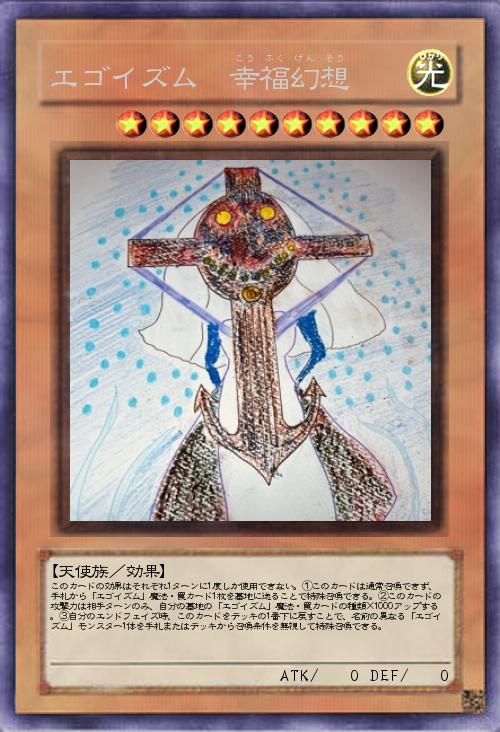| このカードの効果はそれぞれ1ターンに1度しか使用できない。①このカードは通常召喚できず、手札から「エゴイズム」魔法・罠カード1枚を墓地に送ることで特殊召喚できる。②このカードの攻撃力は相手ターンのみ、自分の墓地の「エゴイズム」魔法・罠カードの種類×1000アップする。③自分のエンドフェイズ時、このカードをデッキの1番下に戻すことで、名前の異なる「エゴイズム」モンスター1体を手札またはデッキから召喚条件を無視して特殊召喚できる。 | |||