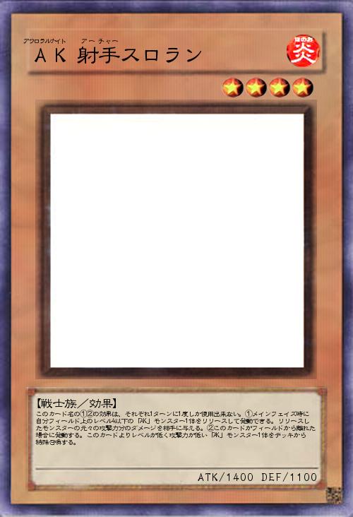 | このカード名の①②の効果は、それぞれ1ターンに1度しか使用出来ない。①メインフェイズ時に自分フィールド上のレベル4以下の「AK」モンスター1体をリリースして発動できる。リリースしたモンスターの元々の攻撃力分のダメージを相手に与える。②このカードがフィールドから離れた場合に発動する。このカードよりレベルが低く攻撃力が低い「AK」モンスター1体をデッキから特殊召喚する。 | |||