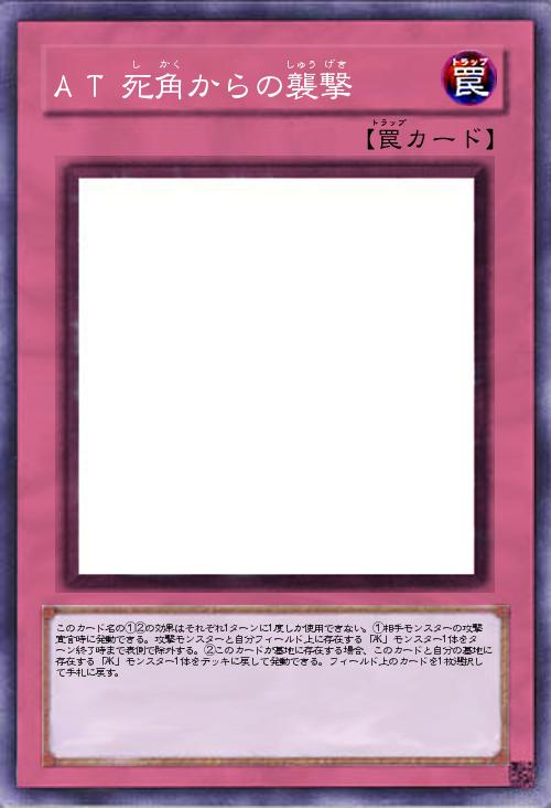 | このカード名の①②の効果はそれぞれ1ターンに1度しか使用できない。①相手モンスターの攻撃宣言時に発動できる。攻撃モンスターと自分フィールド上に存在する「AK」モンスター1体をターン終了時まで表側で除外する。②このカードが墓地に存在する場合、このカードと自分の墓地に存在する「AK」モンスター1体をデッキに戻して発動できる。フィールド上のカードを1枚選択して手札に戻す。 | |||