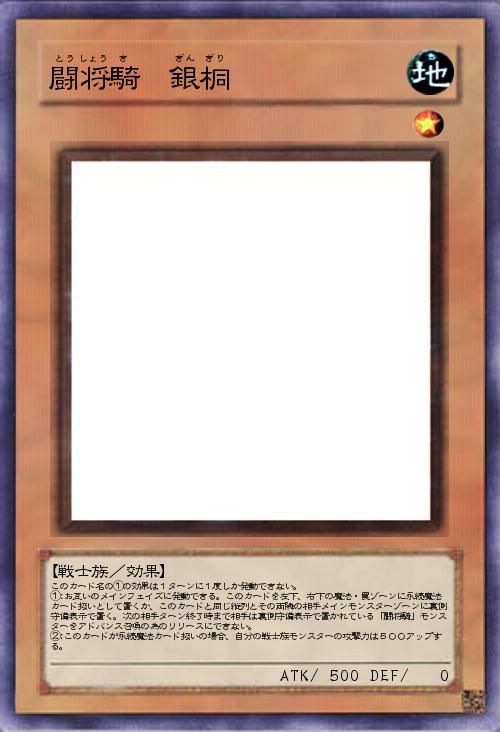 | このカード名の①②③の効果はそれぞれ1ターンに1度しか発動できない。 ①:お互いのメインフェイズに発動できる。このカードを左下、右下の魔法・罠ゾーンに永続魔法カード扱いとして置くか、このカードと同じ縦列とその両隣の相手メインモンスターゾーンに裏側守備表示で置く。次の相手ターン終了時まで相手は裏側守備表示で置かれている「闘将騎」モンスターをアドバンス召喚の為のリリースにできない。 ②:このカードが永続魔法カード扱いの場合、自分の戦士族モンスターの攻撃力は500アップする。 | |||