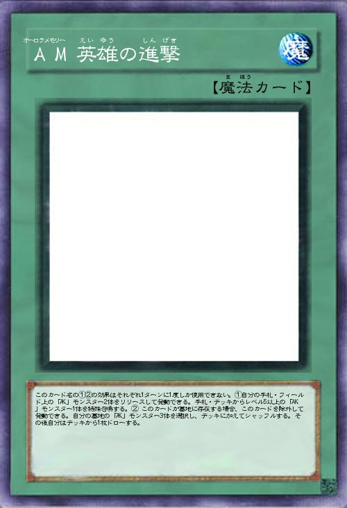 | このカード名の①②の効果はそれぞれ1ターンに1度しか使用できない。①自分の手札・フィールド上の「AK」モンスター2体をリリースして発動できる。手札・デッキからレベル5以上の「AK」モンスター1体を特殊召喚する。② このカードが墓地に存在する場合、このカードを除外して発動できる。自分の墓地の「AK」モンスター3体を選択し、デッキに加えてシャッフルする。その後自分はデッキから1枚ドローする。 | |||