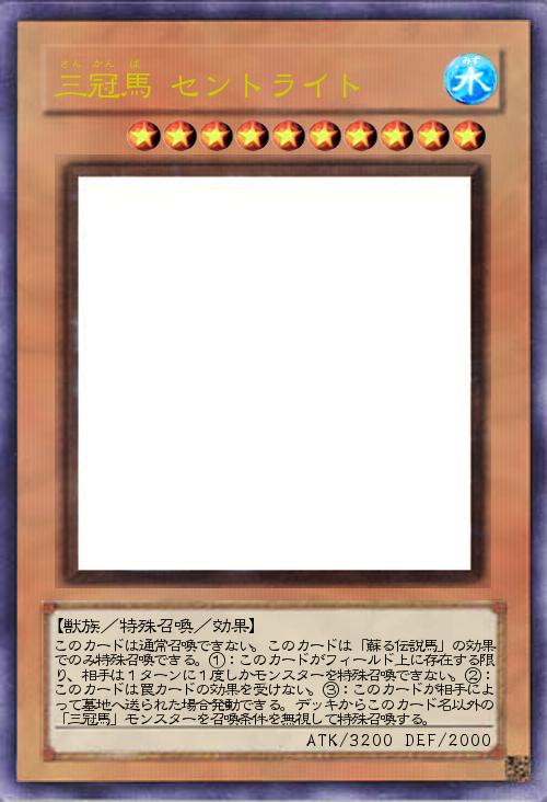 | このカードは通常召喚できない。このカードは「蘇る伝説馬」の効果でのみ特殊召喚できる。①:このカードがフィールド上に存在する限り、相手は1ターンに1度しかモンスターを特殊召喚できない。②:このカードは罠カードの効果を受けない。③:このカードが相手によって墓地へ送られた場合発動できる。デッキからこのカード名以外の「三冠馬」モンスターを召喚条件を無視して特殊召喚する。 | |||