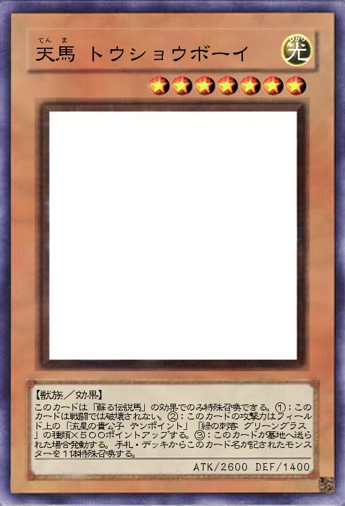 | このカードは「蘇る伝説馬」の効果でのみ特殊召喚できる。①:このカードは戦闘では破壊されない。②:このカードの攻撃力はフィールド上の「流星の貴公子 テンポイント」「緑の刺客 グリーングラス」の種類×500ポイントアップする。③:このカードが墓地へ送られた場合発動する。手札・デッキからこのカード名が記されたモンスターを1体特殊召喚する。 | |||