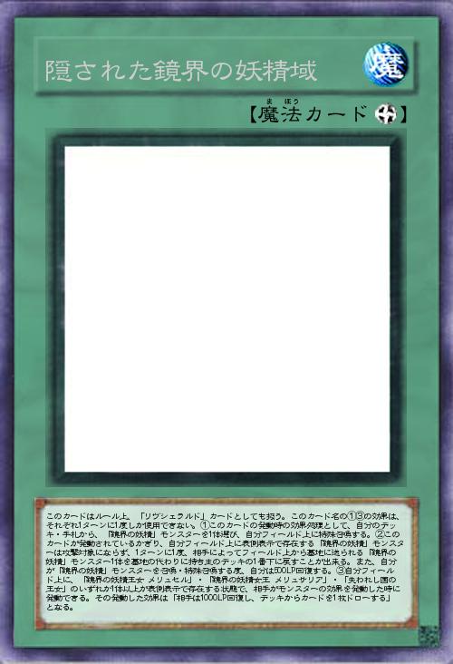 | このカードはルール上、「リヴシェラルド」カードとしても扱う。このカード名の①③の効果は、それぞれ1ターンに1度しか使用できない。①このカードの発動時の効果処理として、自分のデッキ・手札から、「鏡界の妖精」モンスターを1体選び、自分フィールド上に特殊召喚する。②このカードが発動されているかぎり、自分フィールド上に表側表示で存在する「鏡界の妖精」モンスターは攻撃対象にならず、1ターンに1度、相手によってフィールド上から墓地に送られる「鏡界の妖精」モンスター1体を墓地の代わりに持ち主のデッキの1番下に戻すことが出来る。また、自分が「鏡界の妖精」モンスターを召喚・特殊召喚する度、自分は500LP回復する。③自分フィールド上に、「鏡界の妖精王女 メリュセル」・「鏡界の妖精女王 メリュサリア」・「失われし国の王女」のいずれか1体以上が表側表示で存在する状態で、相手がモンスターの効果を発動した時に発動で | |||