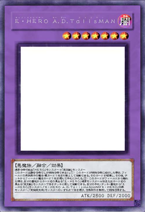 | 通常召喚可能な「HERO」モンスター+「宝玉獣」モンスター このカードは融合召喚でしか特殊召喚できない。①:このカードが特殊召喚に成功した場合、フィールドの表側表示の魔法・罠カード1枚を対象として発動できる。そのカードを破壊し、その後、デッキからフィールド魔法カード1枚を選んで手札に加える。②:このカードがフィールドから離れた場合、自分の墓地からカード名の異なる「E・HERO」通常モンスター4体またはカード名の異なる「宝玉獣」モンスター7体をデッキに戻して発動できる。自分の手札・デッキ・墓地から「E-HERO」モンスター、「E・HERO A.D.TalisMAN」以外の「E・HERO」効果モンスター、「究極宝玉神」モンスターのいずれか1体を選び、召喚条件を無視して特殊召喚する。 | |||