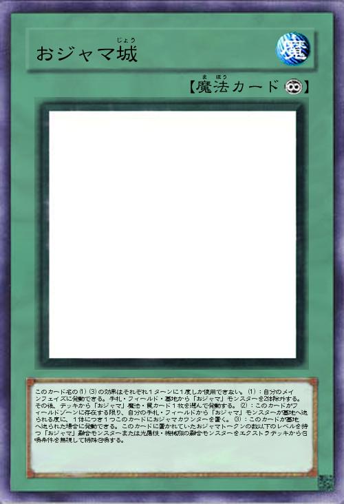 | このカード名の(1)(3)の効果はそれぞれ1ターンに1度しか使用できない。(1):自分のメインフェイズに発動できる。手札・フィールド・墓地から「おジャマ」モンスターを2体除外する。その後、デッキから「おジャマ」魔法・罠カード1枚を選んで発動する。(2):このカードがフィールドゾーンに存在する限り、自分の手札・フィールドから「おジャマ」モンスターが墓地へ送られる度に、1体につき1つこのカードにおジャマカウンターを置く。(3):このカードが墓地へ送られた場合に発動できる。このカードに置かれていたおジャマトークンの数以下のレベルを持つ「おジャマ」融合モンスターまたは光属性・機械族の融合モンスターをエクストラデッキから召喚条件を無視して特殊召喚する。 | |||