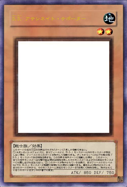 | このカードの名の①②の効果はそれぞれ1ターンに1度しか発動できない。 ①:お互いのバトルフェイズに、自分フィールドに「D.D.」モンスター以外のモンスターが存在しない場合、フィールドのこのカードを除外して発動できる。デッキからレベル4以下の戦士族「D.D.」モンスター1体を特殊召喚する。この効果を相手ターンに発動した場合 、このターン、全ての相手モンスターは攻撃可能な場合は特殊召喚したそのモンスターおよびその同名のモンスターに攻撃しなければならない。②:このカードが除外されている状態で、自分フィールドのレベル4以下の「D.D.」モンスターが戦闘で破壊された場合に発動できる。墓地および除外されている自分のカードの中から、そのモンスターと同名のモンスターを1体選んで特殊召喚し、除外されているこのカードをデッキの1番下に戻す。 | |||