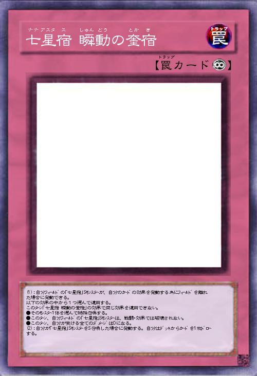 | (1):自分フィールドの「七星宿」Sモンスターが、自分のカードの効果を発動する為にフィールドを離れた場合に発動できる。 以下の効果の中から1つ選んで適用する。 このターン「七星宿 瞬動の奎宿」の効果で同じ効果を適用できない。 ●そのモンスター1体を選んで特殊召喚する。 ●このターン、自分フィールドの「七星宿」Sモンスターは、戦闘・効果では破壊されない。 ●このターン、自分が受ける全てのダメージは0になる。 (2):自分が「七星宿」SモンスターをS召喚した場合に発動する。自分はデッキからカードを1枚ドローする。 | |||