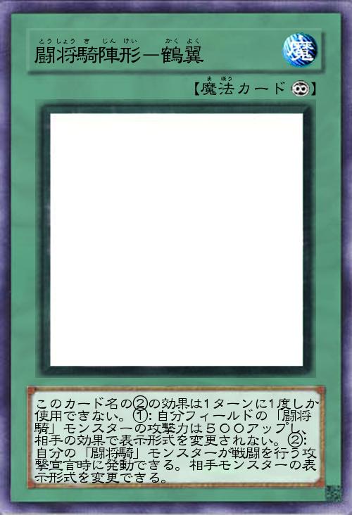 | このカード名の②の効果は1ターンに1度しか使用できない。①:自分フィールドの「闘将騎」モンスターの攻撃力は500アップし、相手の効果で表示形式を変更されない。②:自分の「闘将騎」モンスターが戦闘を行う攻撃宣言時に発動できる。相手モンスターの表示形式を変更できる。 | |||
