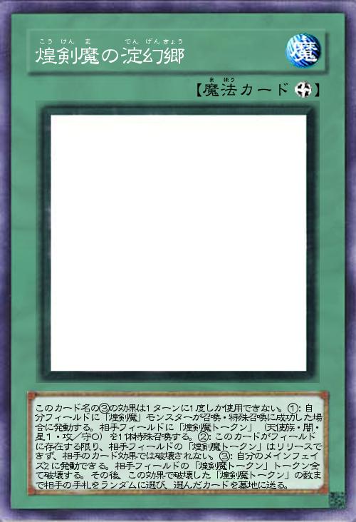 | このカード名の③の効果は1ターンに1度しか使用できない。①:自分フィールドに「煌剣魔」モンスターが召喚・特殊召喚に成功した場合に発動する。相手フィールドに「煌剣魔トークン」(天使族・闇・星1・攻/守0)を1体特殊召喚する。②:このカードがフィールドに存在する限り、相手フィールドの「煌剣魔トークン」はリリースできず、相手のカード効果では破壊されない。③:自分のメインフェイズ2に発動できる。相手フィールドの「煌剣魔トークン」トークン全て破壊する。その後、この効果で破壊した「煌剣魔トークン」の数まで相手の手札をランダムに選び、選んだカードを墓地に送る。 | |||