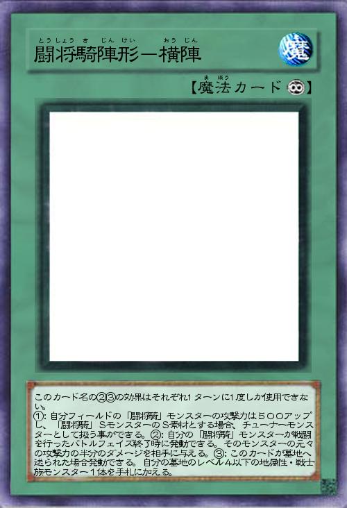 | このカード名の②③の効果はそれぞれ1ターンに1度しか使用できない。 ①:自分フィールドの「闘将騎」モンスターの攻撃力は500アップし、「闘将騎」SモンスターのS素材とする場合、チューナーモンスターとして扱う事ができる。②:自分の「闘将騎」モンスターが戦闘を行ったバトルフェイズ終了時に発動できる。そのモンスターの元々の攻撃力の半分のダメージを相手に与える。③:このカードが墓地へ送られた場合発動できる。自分の墓地のレベル4以下の地属性・戦士族モンスター1体を手札に加える。 | |||