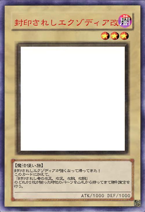 | 封印されしエクゾディアが強くなって帰ってきた! このカードに加えて、 「封印されし者の左足、右足、左腕、右腕」 のどれか2枚が揃った時他のパーツを山札から持ってきて勝利宣言を行う。 | |||