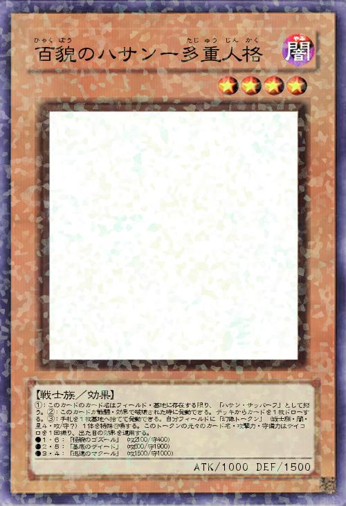 | ①:このカードのカード名はフィールド・墓地に存在する限り、「ハサン・サッバーフ」として扱う。②:このカードが戦闘・効果で破壊された時に発動できる。デッキからカードを1枚ドローする。③:手札を1枚墓地へ捨てて発動できる。自分フィールドに「幻像トークン」(戦士族・闇・星4・攻/守?)1体を特殊召喚する。このトークンの元々のカード名・攻撃力・守備力はサイコロを1回振り、出た目の効果を適用する。 ●1・6:「怪腕のゴズール」(攻2100/守400) ●2・5:「基底のザイード」(攻600/守1900) ●3・4:「迅速のマクール」(攻1500/守1000) | |||