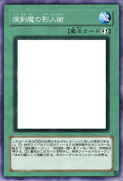 | このカード名の①②の効果はそれぞれ1ターンに1度しか使用できない。①:相手フィールドに自分フィールドの表側表示のモンスターの数まで「煌剣魔トークン」(天使族・闇・星1・攻/守0)を特殊召喚する。②:墓地のこのカードを除外し、相手フィールドのトークン1体を対象にして発動できる。そのトークンのコントロールを得る。 | |||