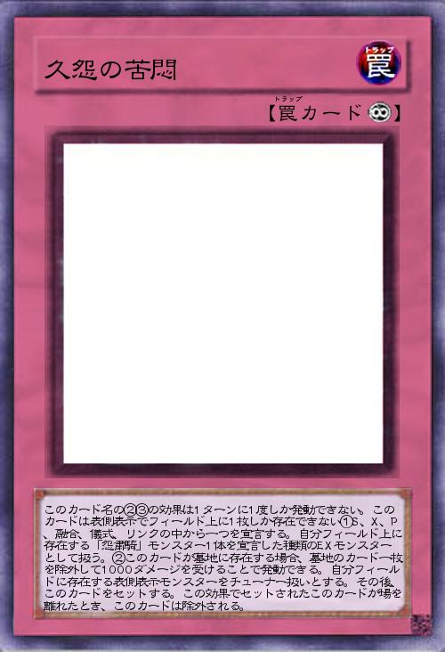 | このカード名の②③の効果は1ターンに1度しか発動できない。このカードは表側表示でフィールド上に1枚しか存在できない①S、X、P、融合、儀式、リンクの中から一つを宣言する。自分フィールド上に存在する「怨粛騎」モンスター1体を宣言した種類のEXモンスターとして扱う。②このカードが墓地に存在する場合、墓地のカード一枚を除外して1000ダメージを受けることで発動できる。自分フィールドに存在する表側表示モンスターをチューナー扱いとする。その後、このカードをセットする。この効果でセットされたこのカードが場を離れたとき、このカードは除外される。 | |||